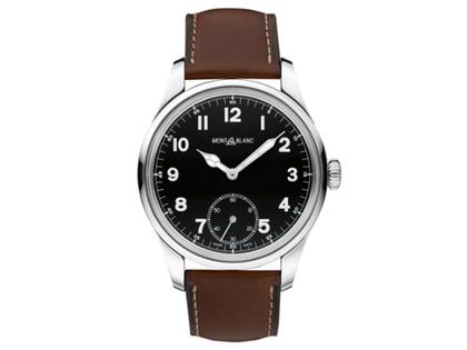 Herrenuhr Handaufzug, Kaliber MB23.03, 46 Stunden Gangreserve, Edelstahl, Durchmesser 44mm, Höhe 11mm, schwarzes Zifferblatt, beige Leuchtmasse (SuperlumiNova), Vintage Look der 1930er, kleine Sekunde bei 6 Uhr, historisches Montblanc Emblem, braunes Lederband mit beiger Kontrastnaht und Dornschließe, Saphirglas, Glasboden, 3 bar wasserdicht