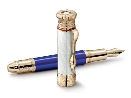 Der Patron of Art Ludwig II Kolbenfüllfederhalter ist auf 4810 Stück weltweit limitiert. Der Clip hat die Form eines Schwanenhalses und die Applikationen sind in einem dezenten champagnerfarbenem Goldton gehalten. Der Korpus ist aus durchscheinend blauem Lack gestaltet und verweist damit auf die blaue Farbe im königlichen Porträt. Im Kontrast dazu trägt die Kappe einen transparenten Lack über einer feinen Guillochierung, die an weiße Federn erinnert. Die handbearbeitete Goldfeder aus 18karätigem Gold trägt die Gravur der 4810 und eine Ansicht des Schlosses Neuschwanstein. Die Form der königlichen Krone am Kappenkopf und der gravierte Schriftzug auf dem goldenen Konus sind vom königlichen Wappen des bayrischen Monarchen inspiriert. Als Hommage an die Oper, die den jungen Ludwig II zu seinem Mäzenatentum veranlasste, ziert den champagnerfarben vergoldeten Ring der gravierte Schriftzug „WWV 75“, das Wagner-Werks-Verzeichnis für Lohengrin.