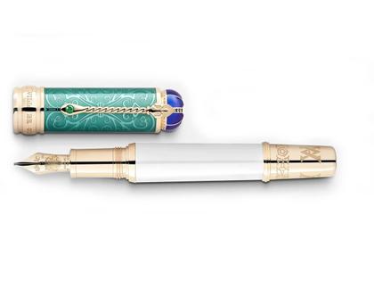 Der limitierte Füllfederhalter verfügt über einen perlweiß lackierten Korpus sowie über eine Kappe in durchscheinend minzgrünem Lack über einem viktorianischen Muster. Die Beschläge sind signaturvergoldet - eine raffinierte Nuance von Gelbgold, das hier in einen etwas helleren Farbton tendiert. Die Form des Clips ist eine Hommage an das Zepter der Königun und der grüne synthetische Edelstein verweist auf ihren Verlobungsring. Der Kappenkopf ist von einer königlichen Krone inspiriert und wird von einem Montblanc Emblem aus weißem Edelharz geziert. In den Kappenring ist das Zitat „I will be good“ eingraviert, und eine besondere Gravur ziert den Konus. Als Hommage an Victorias Spitznamen „England‘s Rose“ ist die handgefertigte Feder aus 750er Massivgold mit einer geprägten Rose versehen.