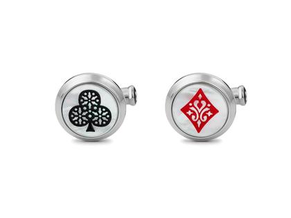 Manschettenknöpfe aus poliertem Edelstahl, mit einer weißen Perlmuttintarsie, geprägtes Kreuzass- und Karoasssymbol in schwarz und rot, Clip-Schließe