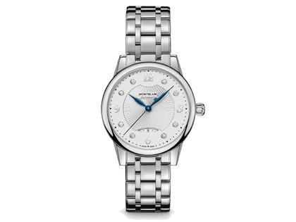 Automatikwerk MB24.14, mit einem Gangreserve von ca. 38 Stunden, Edelstahlgehäuse im Durchmesser von 30 mm, silbrig-weißes Guilloche-Zifferblatt mit 90 Facetten, arabische Ziffern und Diamant-Indizes, 0,052 ct, gebläute Zeiger, Datumsanzeige auf der 6-Uhr Position, Edelstahlarmband mit Dreifach-Faltschließe, Saphirglas, 3 bar wasserdicht