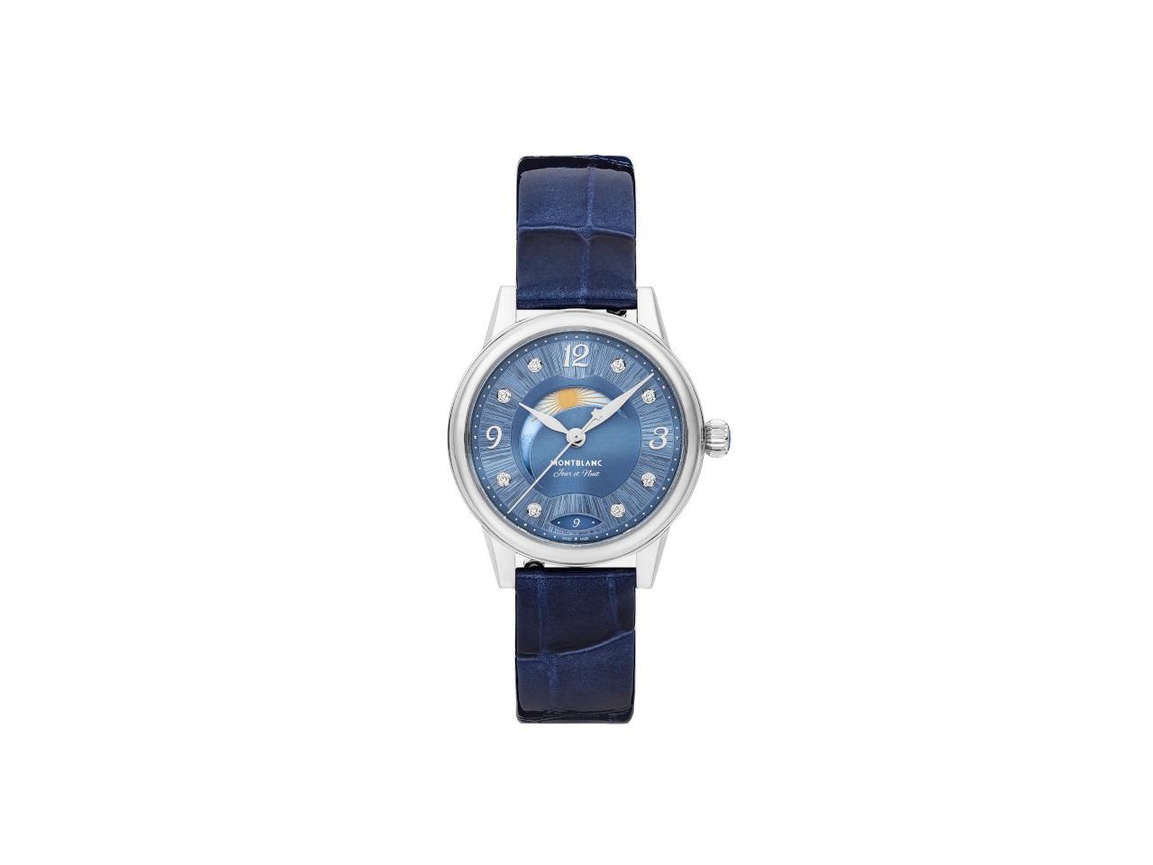 Die Montblanc Bohème Day & Night mit ihrem 30-mm-Edelstahlgehäuse verbindet auf elegante und feminine Weise die traditionellen Elemente der Uhrmacherkunst und ist von der Welt des handgeschriebenen Wortes sowie der Wasserfarben inspiriert. Das stilvolle, gebürstete blaue Zifferblatt ist mit Diamantindizes sowie rhodinierten, floralen arabischen Ziffern und Zeigern gestaltet. Zu den besonderen Details gehören ein „filet sauté“-Muster und eine Prägetechnik namens „filé d’étoiles“. Das Modell ist mit dem Automatikkaliber MB 24.20 ausgestattet und zeigt die Stunden, Minuten und Sekunden an. Das Datum erscheint in einer mandelförmigen Öffnung mit handgeschriebenen Ziffern, was dem Design eine persönliche Note verleiht. Für den Tag- und Nachtverweis „Jour et Nuit“ wurde ebenfalls eine romantische Schriftart gewählt. Die beeindruckende Tag- und Nachtkomplikation zeigt den wechselnden Himmel über 24 Stunden und verleiht der Uhr einen künstlerischen und romantischen Charakter, da sie mit Wasserfarben gestaltet wurde. Die Uhr wird mit einem austauschbaren blauen Kalbslederarmband mit Alligatorlederprägung sowie einem weiteren Armband geliefert.