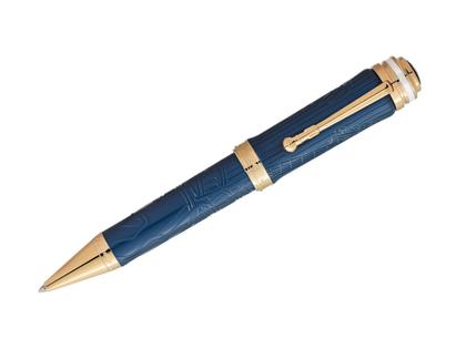Kugelschreiber, Clip in Sonderform aus Metall mit Gelbvergoldung, Korpus aus Edelharz in Blau mit besonderem Muster, Kappe aus Edelharz in Blau mit besonderem Muster, Farbe Blue Jean, Abmessungen 141,2 mm x 17,7 mm