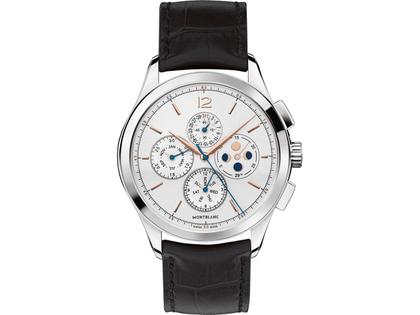 Automatikuhr, Chronograph, Kaliber MB 25.09, Edelstahlgehäuse mit einem Durchmesser von 42 mm, siberfarbenes Zifferblatt mit Datums-, Wochentags-, Monats- und Mondphasenanzeige, schwarzes Alligatorlederband, Saphirglas, Glassichtboden, 3 bar wasserdicht