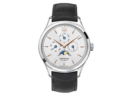 Montblanc Heritage Chronometrie Quantième, Jahres Kalender, Automatikuhr, Kaliber MB 29.18, rund, Edelstahl, Durchmesser 40 mm, silberfarbenes Zifferblatt mit Mondphase, Tages-, Datums- und Jahresanzeige, schwarzes Alligator-Lederband mit Faltschließe, Saphirglas, 3 bar wasserdicht