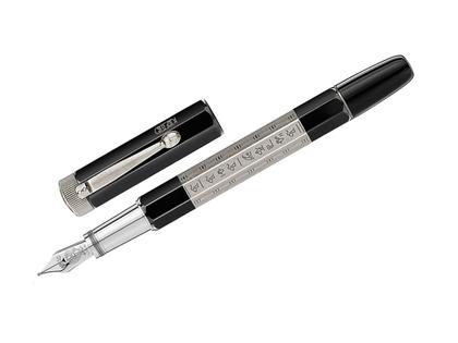 Füllfederhalter Egyptomania Doue, Zylinder aus Metall mit achteckiger Form Palladium beschichtet, Edelharz schwarz, antike palladiumbeschichtete Beschläge, Feder aus 585/- Weißgold eingeprägtes Muster eines Skarabäus