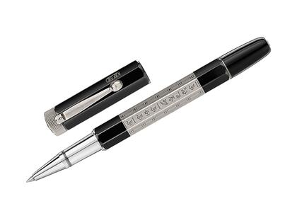 Rollerball Egyptomania Doue, Zylinder aus Metall mit achteckiger Form Palladium beschichtet, Edelharz schwarz, antike palladiumbeschichtete Beschläge
