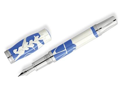 Füllfederhalter, Korpus und Kappe aus Metall mit blauem und weißen Edellack, Clip und Beschläge platiniert, handgefertigte Feder aus 750/- rhodiniertem Gelbgold, Feder in Stärke M