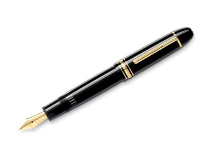 Füllfederhalter, Korpus und Kappe aus schwarzem Edelharz, handgefertigte gebogene Feder aus massivem 750/- Gold, vergoldeter Clip und Beschläge, Montblanc-Logo auf Kappe, Maße 147,3 x 10,0 mm