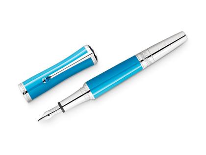 Füllfederhalter, Korpus und Kappe aus blauem Edelharz, platinierter Clip mit syntischem Spinell, Feder in Größe M aus 585/- Gelbgold, rhodiniert