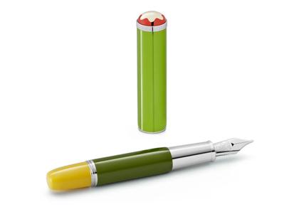 Korpus aus grünen und gelben Edellack, mit Montblanc Stern aus koralle- und elfenbeinfarbigen Edelharz, platinierte Beschläge, Feder aus 585/- Weißgold