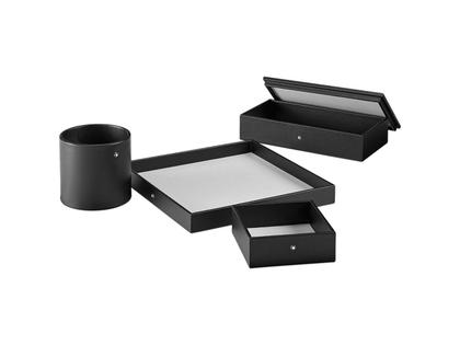 ein Ausleerbehälter im Taschenformat, ein runter Stiftehalter, eine Schreibtischbox und eine Schreibtischablage aus weichem, schwarzem Kalbsleder mit einem Futter aus grauem Wildleder.