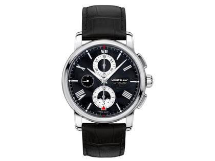 Verziert mit dem guillochierten Motiv eines explodierenden Montblanc Emblems, bietet es applizierte rhodinierte römische Ziffern und Indizes. Das Datum wird über ein rotes Dreieck bei 6 Uhr angezeigt. Die zentralen Regattazeiger für die Stunden und Minuten verfügen über eine Super-LumiNova-Beschichtung, um die Uhrzeit auch in der Dunkelheit präzise ablesen zu können. Für eine optimierte Zeitmessung ist der präzise Minutenring am Zifferblattrand bei 30 und 60 Sekunden mit roten Markierungen ausgestattet. Das 43-mm-Edelstahlgehäuse besitzt gerade Hörner und eine schmale Lünette mit einem satinierten Rand. Abgerundet wird es von einem Alligatorlederarmband.