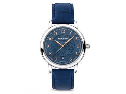 Automatikwerk Kaliber MB 24.17, 38 Stunden Gangdauer, Edelstahlgehäuse im Durchmesser von 39 mm, blaues geprägtes Zifferblatt mit Glacier-Motiv, rosegoldene Ziffern und Zeiger, Saphirglas, dunkelblaues Lederarmband mit Alligatorprägung, Dornschließe, Saphirglas und Saphirglasboden, 5 bar wasserdicht