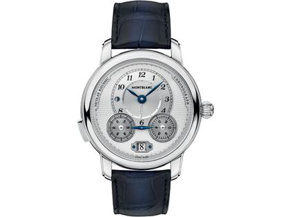 Monopusher Chronograph, Säulenrad mit vertikaler Scheibenkupplung, Doppelfederhaus, zweite Zeitzone, Tag-Nacht-Indikation, 30 Minuten-und 60 Sekundenzähler per Drehscheibe - Hommage an den ersten Zeitschreiber von Nicolas Rieussec aus dem Jahr 1821, Automatik, Kaliber MB R200, Gehäuse Edelstahl, Durchmesser 44,8 mm, Höhe 15,0 mm, silber-weißes Titan-Zifferblatt, dunkelblaues Alligatorlederband (Sfumato) mit Faltschließe, Saphirglas, Glasboden, 3 bar wasserdicht