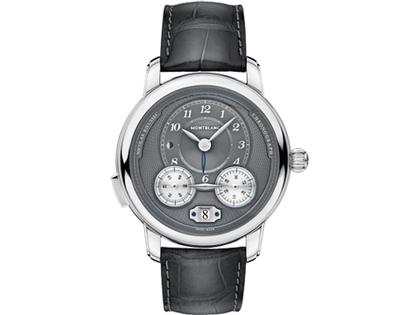 Monopusher Chronograph, Säulenrad mit vertikaler Scheibenkupplung, Doppelfederhaus, zweite Zeitzone, Tag-Nacht-Indikation, 30 Minuten-und 60 Sekundenzähler per Drehscheibe - Hommage an den ersten Zeitschreiber von Nicolas Rieussec aus dem Jahr 1821, Automatik, Kaliber MB R200 mir einer Gangreserve von 72 Stunden, Gehäuse Edelstahl, Durchmesser 44,8 mm, Höhe 15,0 mm, anthrazitfarbenes Zifferblatt mit silberfarbenen Ziffern, graues Alligatorlederband (Sfumato) mit Faltschließe, Saphirglas, Glasboden, 3 bar wasserdicht
