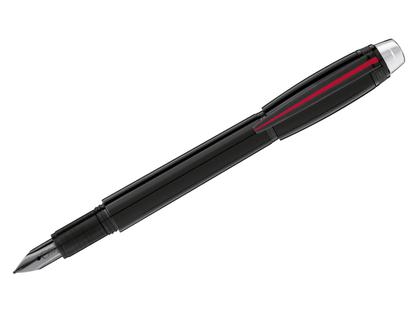 Patronenfüllfederhalter, schwarzes Edelharz, schwebendes Montblanc Emblem im transparenten Kappenkopf, 14 Karat Goldfeder, Rutenium beschichtet, PVD-beschichtete Beschläge mit gebürsteten Oberflächen, roter Akzent