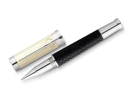 Rollerball, Korpus aus schwarzem Edelharz mit Prägung, elfenbeinfarbene Kappe mit Kompassrose, platinierter Clip in Form eines Belegbagels, Kappenring mit der Signatur von Robert L. Stevenson, Montblanc-Emblem auf der Kappe mit Totenkopf