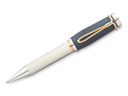 Kugelschreiber, Korpus aus sandfarbenen Edelharz mit Prägung, graublaue "Kappe" mit Relief, vergoldeter Clip in Form einer Kordel eines Retikül (Handtasche), Kappenring mit Gravur eines Kapitels aus „Stolz und Vorurteil“, Montblanc-Emblem auf dem Kappenkopf