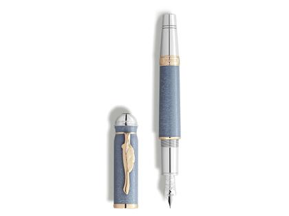 Füllfederhalter, Korpus mit mattblauer Lackierung und Marmor-Prägung, blaue Kappe in Form eines Globus, vergoldeter Clip in Form eines Blattes, Kappenspitze mit Gravur, Montblanc-Emblem auf dem Kappenkopf, Konusring mit Gravur in Form einer Kupferstichillustration, Feder M aus rhodiniertem 585/- Gold mit Sondergravur, Maße 145,9 x 16,9 mm