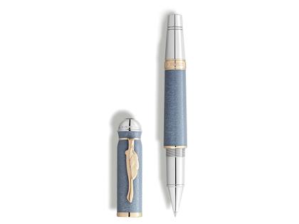 Rollerball, Korpus mit mattblauer Lackierung und Marmor-Prägung, blaue Kappe in Form eines Globus, vergoldeter Clip in Form eines Blattes, Kappenspitze mit Gravur, Montblanc-Emblem auf dem Kappenkopf, Konusring mit Gravur in Form einer Kupferstichillustration, Maße 145,9 x 16,9 mm