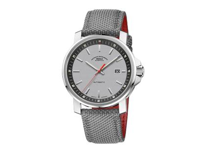 Automatikwerk Sellita SW200-1 (Version Mühle mit patentierter Spechthalsregulierung, eigenem Rotor, charakteristischen Oberflächenveredelungen), 41 Stunden Gangreserve, Edelstahlgehäuse gebürstet/poliert, Durchmesser von 42,4 mm, Höhe 11,3 mm, entspiegeltes Saphirglas, silbergraues Zifferblatt mit Rehaut in Anthrazit, applizierte Indizes, Zeiger nachtleuchtend, graues Canvasarmband mit Dornschließe, Saphirglasboden 10 bar wasserdicht