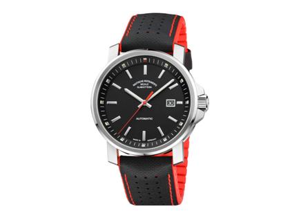 Edelstahlgehäuse Durchmesser 42,4 mm, Höhe 11,3 mm, Saphirglas, Automatikwerk Sellita SW200-1 (Version Mühle: mit eigener Spechthalsregulierung und veredelten Oberflächen), schwarzes Zifferblatt mit applizierten Indizes, Zeiger nachleuchtend, mit Super-LumiNova belegt, 10 bar wasserdicht, schwarzes wasserfestes Lederband auf roter Kautschukschicht, mit Dornschließe, Saphirglasboden
