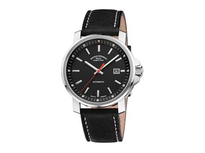 Edelstahlgehäuse Durchmesser 42,4 mm, Höhe 11,3 mm, entspiegeltes Saphirglas, Automatikwerk Sellita SW200 (Version Mühle: mit eigener Spechthalsregulierung und veredelten Oberflächen), schwarzes Zifferblatt mit applizierten Indizes, Zeiger nachleuchtend, mit Super-LumiNova belegt, 10 bar wasserdicht, schwarzes Lederband mit weißer Naht, Dornschließe, Saphirglasboden