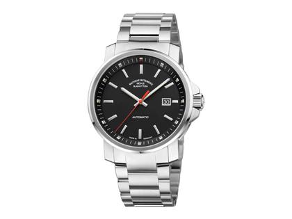 Edelstahlgehäuse Durchmesser 42,4 mm, Höhe 11,3 mm, Saphirglas, Automatikwerk Sellita SW200-1(Version Mühle: mit eigener Spechthalsregulierung und veredelten Oberflächen), schwarzes Zifferblatt mit applizierten Indizes, Zeiger nachleuchtend, mit Super-LumiNova belegt, 10 bar wasserdicht, Edelstahlband mit Doppelfaltschließe, Saphirglasboden