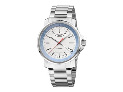 Edelstahlgehäuse Durchmesser 42,4 mm, Höhe 12,2 mm, Saphirglas, Automatikwerk Sellita SW221 (Version Mühle: mit eigener Spechthalsregulierung und veredelten Oberflächen), weißes Zifferblatt mit hellblauem Rehaut mit Datumsskala, applizierten Indizes, Zeiger nachtleuchtend, 10 bar wasserdicht, Edelstahlband mit Faltschließe, Saphirglasboden