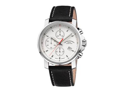 Chronograph, Edelstahlgehäuse Durchmesser 42,4 mm, Höhe 13,9 mm, Saphirglas, Automatikwerk Kaliber MU9413, Basis Sellita SW500 (mit eigner Spechthalsregulierung und veredelten Oberflächen, 62h Gangreserve), weißes Zifferblatt mit applizierten Indizes, Zeiger nachtleuchtend, 10 bar wasserdicht, schwarzes (wahlweise auch braunes) Lederband mit Dornschließe, Saphirglasboden