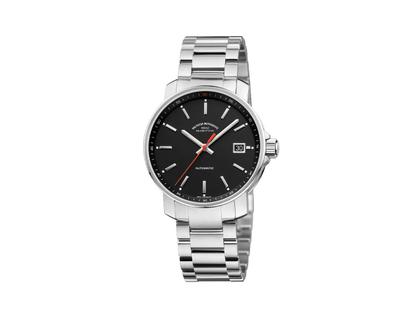Edelstahlgehäuse Durchmesser 36,6 mm, Höhe 10,4 mm, Saphirglas, Automatikwerk Sellita SW200 (Version Mühle: mit eigener Spechthalsregulierung und veredelten Oberflächen), schwarzes Zifferblatt mit applizierten Indizes, Zeiger nachtleuchtend, 10 bar wasserdicht, Edelstahlband mit Faltschließe, Glasboden
