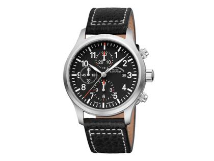 Glashütter Automatikwerk Kaliber MU9413 mit einer Gangreserve von 62 Stunden, Chronograph mit Stoppfunktion, poliertes Edelstahlgehäuse im Durchmesser von 44,0 mm, Höhe 13,6 mm, verschraubte Edelstahl-Krone, Edelstahl-Drücker, schwarzes Zifferblatt, Datumsanzeige auf 3 Uhr, 12-Stunden-Zähler auf 6 Uhr, kleine Sekunde auf 9 Uhr, 30-Minuten-Zähler auf 12 Uhr, silberfarbener Stunden- und Minutenzeiger mit weißer Super-LumiNova Leuchtmasse, silberfarbener Sekundenzeiger mit roter Spitze, arabische Ziffern und Indizes mit weißer Super-LumiNova Leuchtmasse, schwarzes Büffellederarmband mit weißer Ziernaht und Edelstahl-Dornschließe, Saphirglas entspiegelt, Edelstahl-Gehäuseboden mit Saphirglas-Einsatz, 10 bar wasserdicht