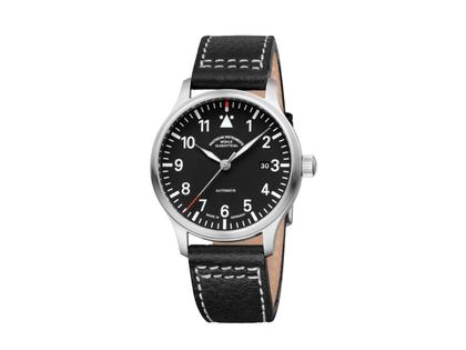Glashütter Automatikwerk Kaliber SW 200-1 mit einer Gangreserve von 41 Stunden, poliertes Edelstahlgehäuse im Durchmesser von 40,0 mm, Höhe 10,0 mm, verschraubte Edelstahl-Krone, schwarzes Zifferblatt, Datumsanzeige auf 3 Uhr, silberfarbener Stunden- und Minutenzeiger mit weißer Super-LumiNova Leuchtmasse, silberfarbener Sekundenzeiger mit roter Spitze, arabische Ziffern und Indizes mit weißer Super-LumiNova Leuchtmasse, schwarzes Büffellederarmband mit weißer Ziernaht und Edelstahl-Dornschließe, Saphirglas entspiegelt, Edelstahl-Gehäuseboden mit Saphirglas-Einsatz, 10 bar wasserdicht