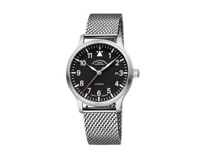 Glashütter Automatikwerk Kaliber SW 200-1 mit einer Gangreserve von 41 Stunden, poliertes Edelstahlgehäuse im Durchmesser von 40,0 mm, Höhe 10,0 mm, verschraubte Edelstahl-Krone, schwarzes Zifferblatt, Datumsanzeige auf 3 Uhr, silberfarbener Stunden- und Minutenzeiger mit weißer Super-LumiNova Leuchtmasse, silberfarbener Sekundenzeiger mit roter Spitze, arabische Ziffern und Indizes mit weißer Super-LumiNova Leuchtmasse, poliertes Edelstahl-Milanaisearmband mit Faltschließe, Saphirglas entspiegelt, Edelstahl-Gehäuseboden mit Saphirglas-Einsatz, 10 bar wasserdicht