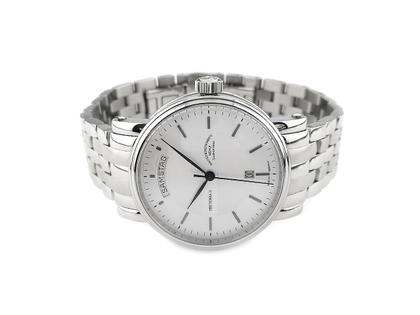Automatikwerk Kaliber Sellita SW240-1 (Version Mühle mit eigener Spechthalsregulierung und veredelten Oberflächen), Edelstahlgehäuse gebürstet, Lünette poliert, Durchmesser 41,0 mm, Höhe 12,3 mm, versilbertes guillochiertes Zifferblatt mit Datum auf 6 Uhr, Edelstahlarmband mit Doppelfaltschließe, Saphirglas gewölbt und entspiegelt, Saphirglasboden verschraubt, 10 bar wasserdicht