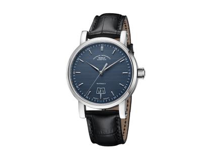 Automatikwerk Kaliber MU9424-GD, 41 Stunden Gangreserve, mit stoßsicherer Spechthalsregulierung, effizientem Mühle-Editionsrotor und charakteristischen Oberflächenveredelungen, Sekundenstopp, Gehäuse aus Edelstahl gebürstet / poliert, Durchmesser 41,0 mm, Höhe 12,6 mm, Länge über Bandanstöße 51,0 mm, anthrazitblaues Zifferblatt mit horizontalem Streifenschliff, Großdatum mit Schnellkorrektur, applizierte silberne Indizes, glanzvernickelte Zeiger, schwarzes Alligatorlederarmband mit Doppelfaltschließe, Saphirglas gewölbt und entspiegelt, Saphirglasboden verschraubt, 10 bar wasserdicht - limitiert auf nur 155 Exemplare weltweit