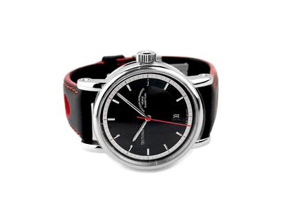 Automatikwerk (Basis ETA2824), Edelstahlgehäuse poliert, Durchmesser 39,0 mm, Höhe 11,0 mm, verschraubte Krone, schwarzes Zifferblatt mit Datum auf 6 Uhr, Zentralsekunde, schwarzes gelochtes Lederarmband mit roter Naht und Faltschließe, gewölbtes und entspiegeltes Saphirglas, Glasboden, 10 bar wasserdicht - limitiert auf 180 Exemplare weltweit
