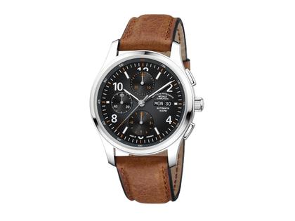 Mühle Glashütte Lunova Chronograph Automatik Edelstahl 42,3mm schwarz-graues Zifferblatt Vintage-Lederband