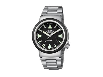 Automatik, Kaliber Sellita SW200, Verison Mühle mit patentierter Spechthalsregulierung, Edelstahlgehäuse, Durchmesser 42 mm, Höhe 13,5 mm, Metallband mit Taucherverlängerung, schwarzes Zifferblatt, schwarzes Datumsfeld, Indizes und Zeiger Super-LumiNova belegt, 4 mm starkes entspiegeltes Saphirglas mit eingeschliffener Lupe, 100 bar wasserdicht, abgerundete Kautschuklünette, geliefert in Spezialbox