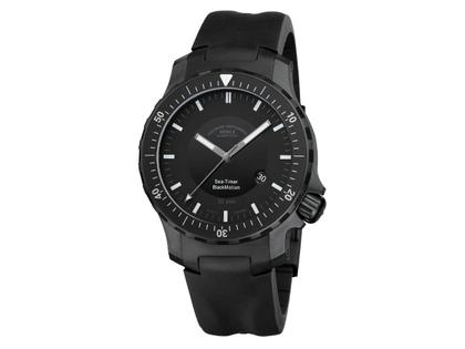 Automatik, Kaliber Sellita SW200-1, Edelstahl mit schwarzer Titancarbid-Beschichtung (TiC im PVD Verfahren), beidseitig drehbare Lünette, Durchmesser 44 mm, Höhe 12,5 mm, schwarzes Kautschukband mit schwarzer Faltschließe aus Edelstahl (schwarz DLC beschichtet), schwarzes Index-Zifferblatt mit Super-LumiNova, 2,5 mm starkes Saphirglas, 30 bar wasserdicht,