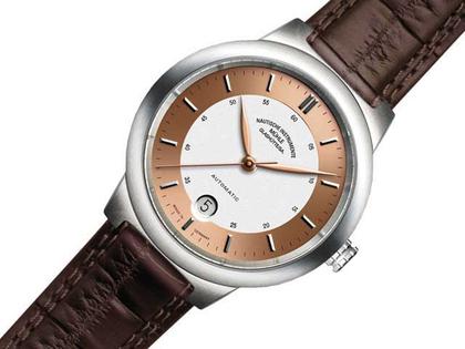 City-Linie, Herrenuhr rund aus Edelstahl gebürstet, Durchmesser 42mm, Höhe 10,5mm, kupferfarbenes Zifferblatt, applizierte Indizes, Saphirglas entspiegelt, verschraubte Krone, Krokolederband, Doppelfaltschließe, 10 bar wasserdicht, Datumsanzeige, Saphirglasboden verschraubt