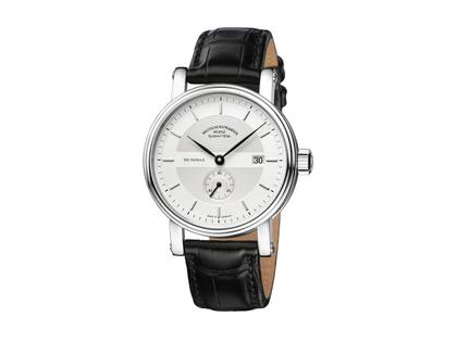 Automatik, Kaliber Sellita SW260-1 (Version Mühle mit eigener Spechthalsregulierung und veredelten Oberflächen), rund, Edelstahl gebürstet, Lünette poliert, Durchmesser 41 mm, Höhe 11,0 mm, versilbertes guillochiertes Zifferblatt, Saphirglas gewölbt und entspiegelt, Saphirglasboden verschraubt, schwarzes Krokolederband mit Doppelfaltschließe, 10 bar wasserdicht