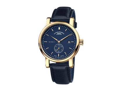 Automatik, Kaliber Sellita SW260-1 (mit eigener Spechthalsregulierung und veredelten Oberflächen), rund, Gehäuse aus 750/- Gelbgold poliert, Durchmesser 41 mm, Höhe 12,6 mm, dunkelblaues Zifferblatt, vergoldete Indizes und Zeiger, Saphirglas gewölbt und entspiegelt, Saphirglasboden verschraubt, dunkelblaues Lederband mit Dornschließe aus 750/- Gold, 10 bar wasserdicht, limitiert auf weltweit nur 50 Exemplare