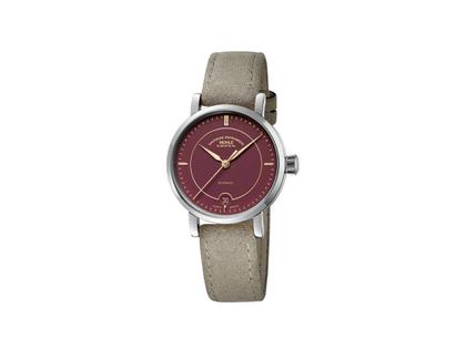 Automatik, Kaliber Sellita SW200-1 (mit eigener Spechthalsregulierung und veredelten Oberflächen), rund, Gehäuse aus Edelstahl, poliert, Durchmesser 33,5 mm, Höhe 10 mm, beeren-rotes Zifferblatt, goldene Indizes und Zeiger, Saphirglas gewölbt und entspiegelt, Saphirglasboden verschraubt, beiges Velourslederband mit Dornschließe und Schnellwechsel-Federstegen, 10 bar wasserdicht