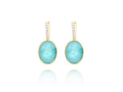 Ohrschmuck aus 750/- Gelbgold, mattiert, besetzt mit dem Anice Stein in der Größe Medium - bestehend aus Bergkristall und Amazonit - mit Brillanten