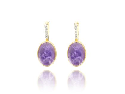 Ohrschmuck aus 750/- Gelbgold, mattiert, besetzt mit dem Violetta Stein in der Größe Medium - bestehend aus Bergkristall, Lepidolith und Perlmutt - mit Brillanten