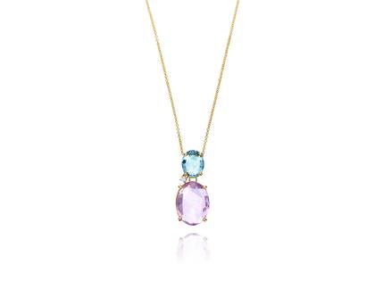 Collier aus 750/- Gelbgold, poliert, 1 Brillant 0,02 ct TW (G) vsi, besetzt mit einem Amethyst 6,5 ct und einem blauen Topas 2,4 ct, 42 cm lang