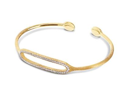 Armspange in 750/- Gelbgold, mattiert, mit Brillanten 0,30 ct TW (G) vsi besetztes O-Element, offen, 16,5 cm lang