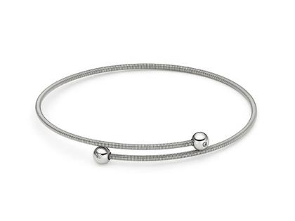 die berühmte Niessing Schnur als Armreif, aus 950/- Platin mit zwei Brillant-Kugeln, 2 Brillanten 0,02 ct TW (F) vsi, 5 mm Kugel-Durchmesser